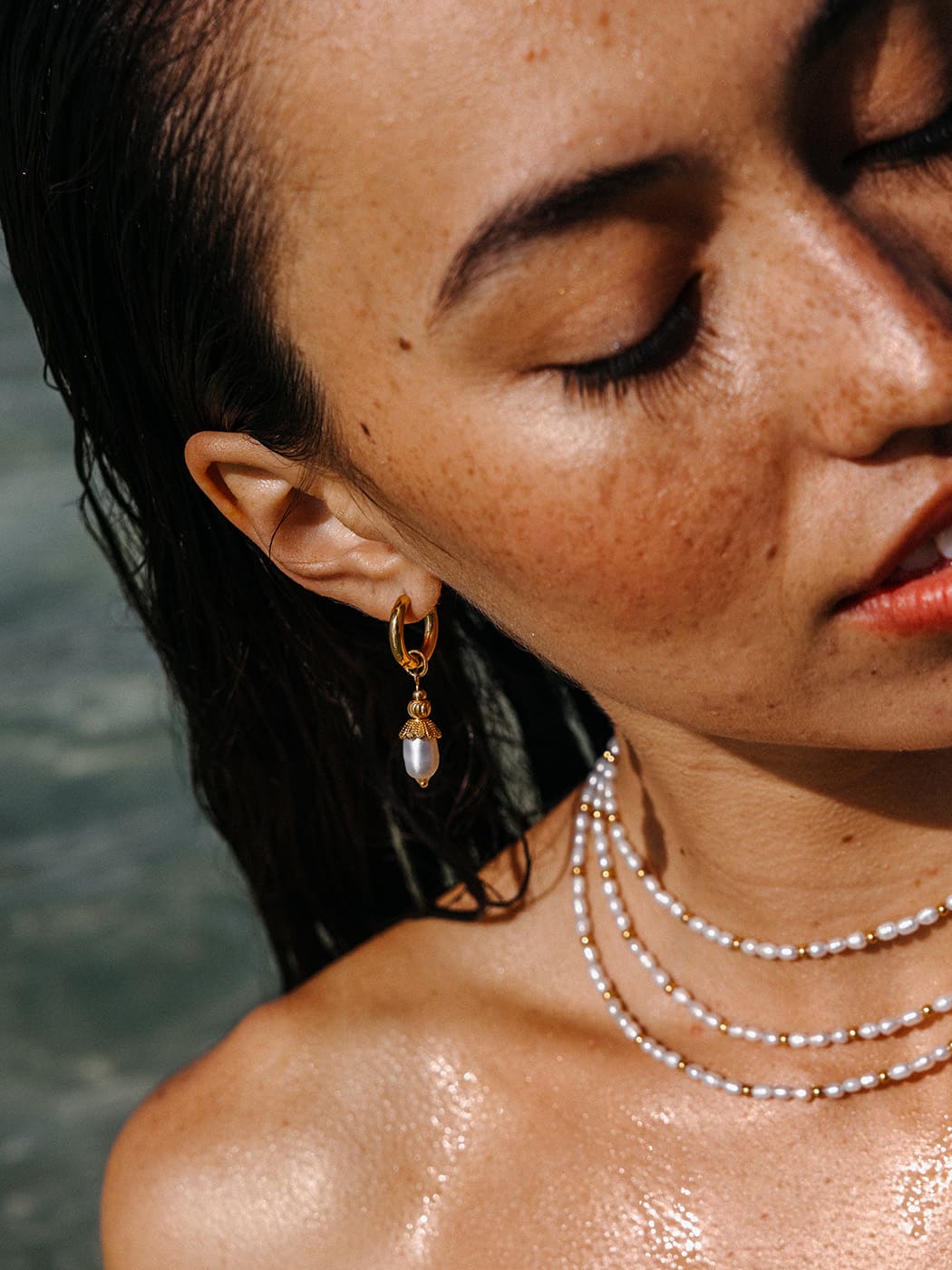 Perlenkette mit goldenen Akzenten von PURELEI, elegant und feminin. Perlenkette und moderne Ohrringe von PURELEI, strahlend am Strand getragen.